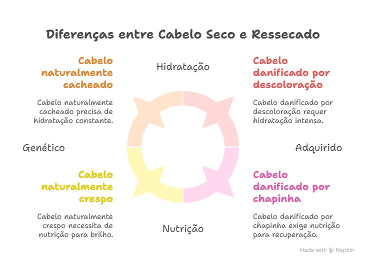 Embora os termos “cabelo seco” e “cabelo ressecado” sejam frequentemente usados como sinônimos, eles descrevem condições com origens diferentes, e entender essa distinção é crucial para escolher o tratamento correto: